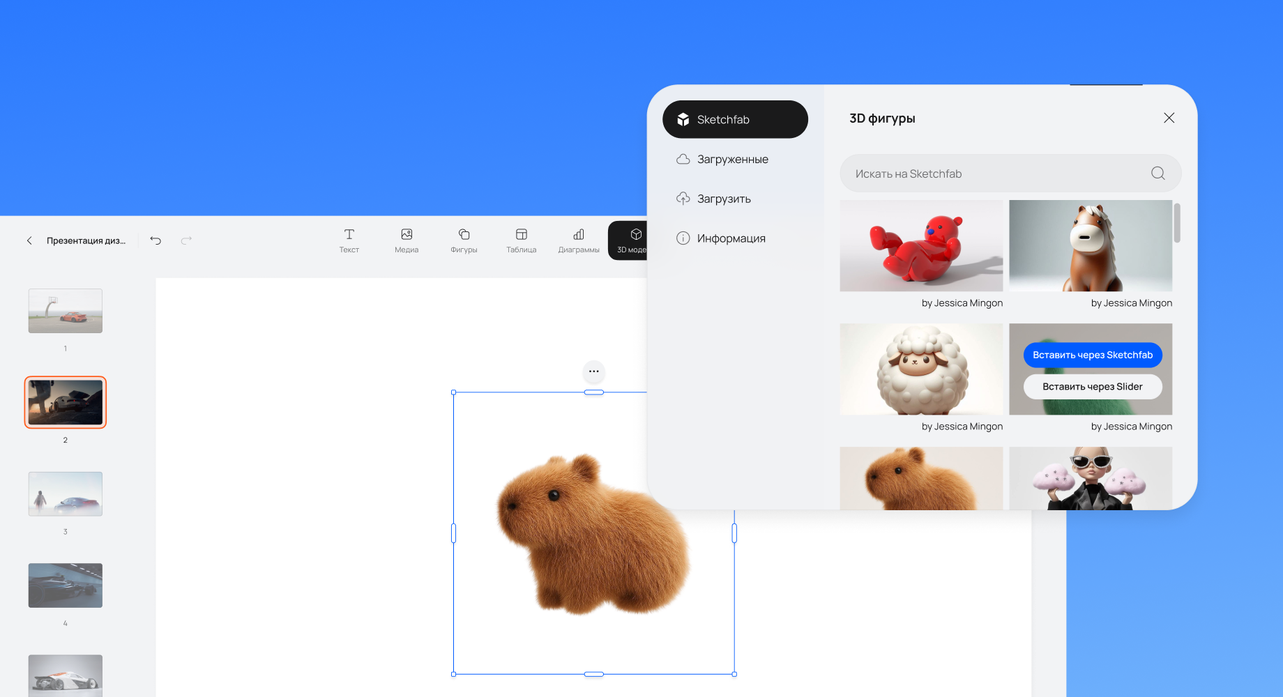 В PowerPoint 3D-модель не загрузишь, да и вообще, загружать каждую модель по отдельности как-то неудобно. А что, если у нас была бы целая библиотека 3D-моделей? Например, как это сделано в Sketchfab, где мы можем искать нужную модель по запросу.