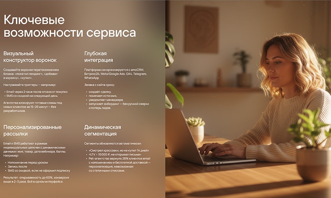 Визуальный конструктор воронок. Собирайте воронки перетаскиванием блоков: «посетил лендинг», «добавил в корзину», «купил». Настраивайте триггеры, например, email через 2 часа после отказа от покупки и SMS со скидкой на следующий день. Агентства клонируют готовые схемы под новых клиентов за 15-20 минут без разработчиков. Персонализированные email и SMS. Рассылки работают в рамках индивидуальных цепочек с динамическими данными: имя, товар, дата вебинара, баллы. Например, клиент онлайн-школы получает напоминание перед уроком, запись после и SMS со скидкой, если не оформил подписку. Это дает открываемость до 60% и в 2–3 раза выше конверсию, всё в одном интерфейсе. Глубокая интеграция. Платформа синхронизируется с amoCRM, Битрикс24, Meta/Google Ads, GA4, Telegram и WhatsApp. Заявка с сайта мгновенно создает сделку, помечает источник, уведомляет менеджера и запускает онбординг без ручной сверки и потерь лидов. Динамическая сегментация. Сегменты обновляются автоматически: «смотрел кроссовки, но не купил 14 дней» или «LTV > 10 000 ₽, не открывал письма». Pet-агентство вернуло 28% таких клиентов email с напоминанием о подписке и бесплатной доставкой, персонализация, недоступная при работе со статичными списками.
